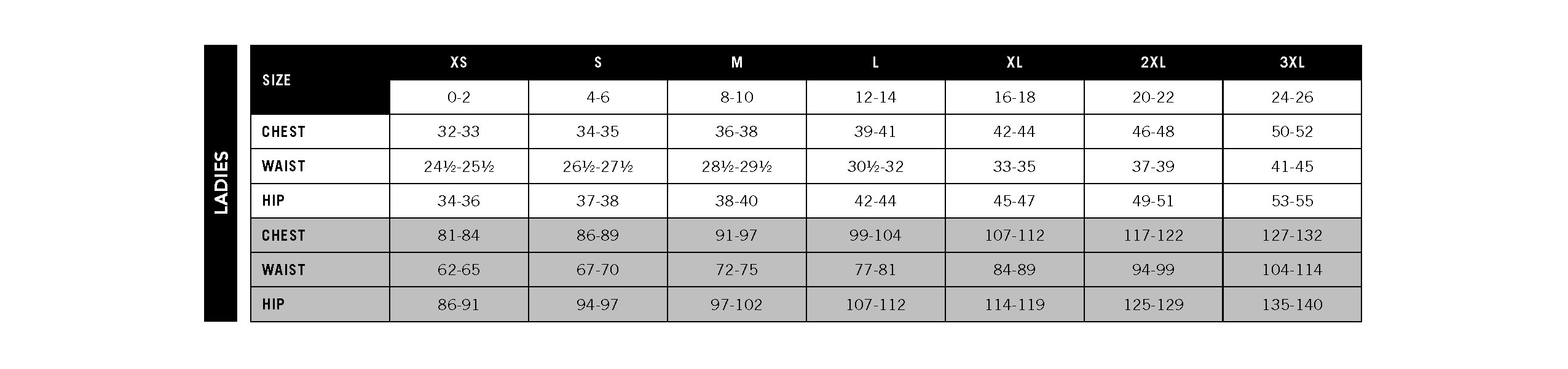 | HIP (Centimeters) | 94-97 | 97-102 | 107-112 | 114-119 |